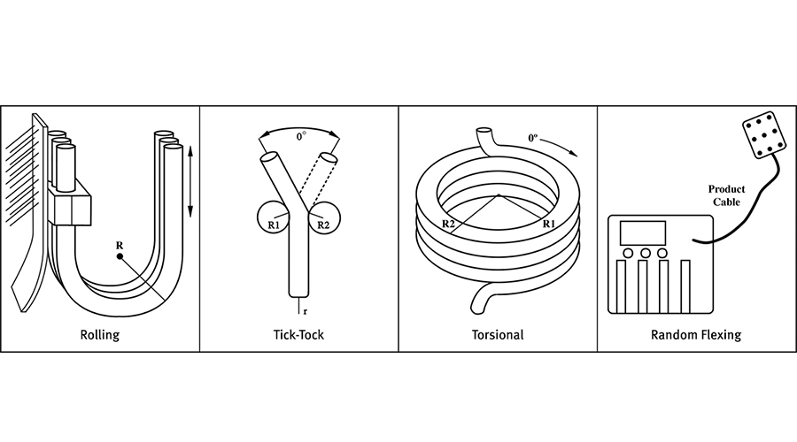電纜如圖所示的四種基本運動中一種或多種方式彎曲,每一次電纜彎曲時其導體和屏蔽層都會受到壓力。金屬對抗重復應力的抵抗力較差,即使應力保持在15%伸長率的屈服點以下,金屬剪切應力的抵抗力也非常低,PBO鍍金屬高分子纖維就是為了替代金屬防波套而被研發(fā)。