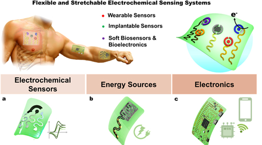 通過(guò)柔性生物傳感器可連續(xù)獲取溫度、壓力、應(yīng)力等物理信號(hào)來(lái)實(shí)現(xiàn)對(duì)人體活動(dòng)情況,如心率、血壓、腦電圖、心電圖等,但連續(xù)監(jiān)測(cè)人體體液、呼出氣中的各類化學(xué)物質(zhì)的可穿戴傳感器仍面臨許多問(wèn)題,比如傳感器的柔韌性、靈敏度、準(zhǔn)確性以及與人體皮膚的貼合性等。