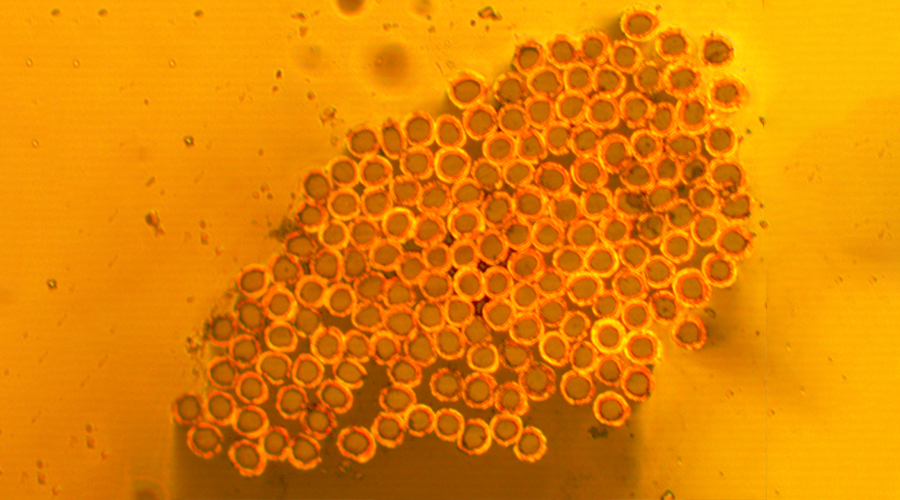 大連義邦Syscom鍍金屬纖維絲,采用專有的化學(xué)電鍍工藝,將金屬涂層與基材牢固的結(jié)合在一起,通過電鏡觀察,一股PBO纖維有166根,下述圓形代表纖維的橫截面,圓環(huán)代表金屬涂層,通過觀察,發(fā)現(xiàn)一股PBO纖維里面的166根,每根都有圓環(huán)包覆,均勻且牢固的與非金屬基材結(jié)合在一起,金屬結(jié)合度高達(dá)80%以上,因此在實(shí)際使用的過程中,不會(huì)因?yàn)榉磸?fù)摩擦,清洗,導(dǎo)致金屬涂層脫落,影響導(dǎo)電性,屏蔽性。